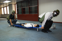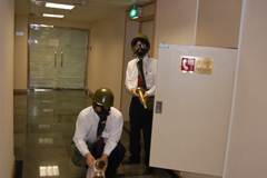 上午10时,演练正式开始。广场保安部中控室值班人员接到A座517房间火警报告后,立即要求保安巡查人员到达现场确认,并报告广场应急指挥部。应急指挥部随即通知灭火组和救护组赶赴现场组织灭火、抢救伤员。确定火场及火势无法控制后,应急指挥部迅速报119、120请求增援,并宣布启动火灾应急预案,切断电梯电源,开启应急广播,组织A座办公人员紧急疏散,由治安组和交管组负责维持秩序、做好疏散工作。A座各层办公人员在楼层疏导人员的指挥下,迅速从楼梯有秩序地下到广场两侧指定地点集合待命。演练于10时30分圆满结束。